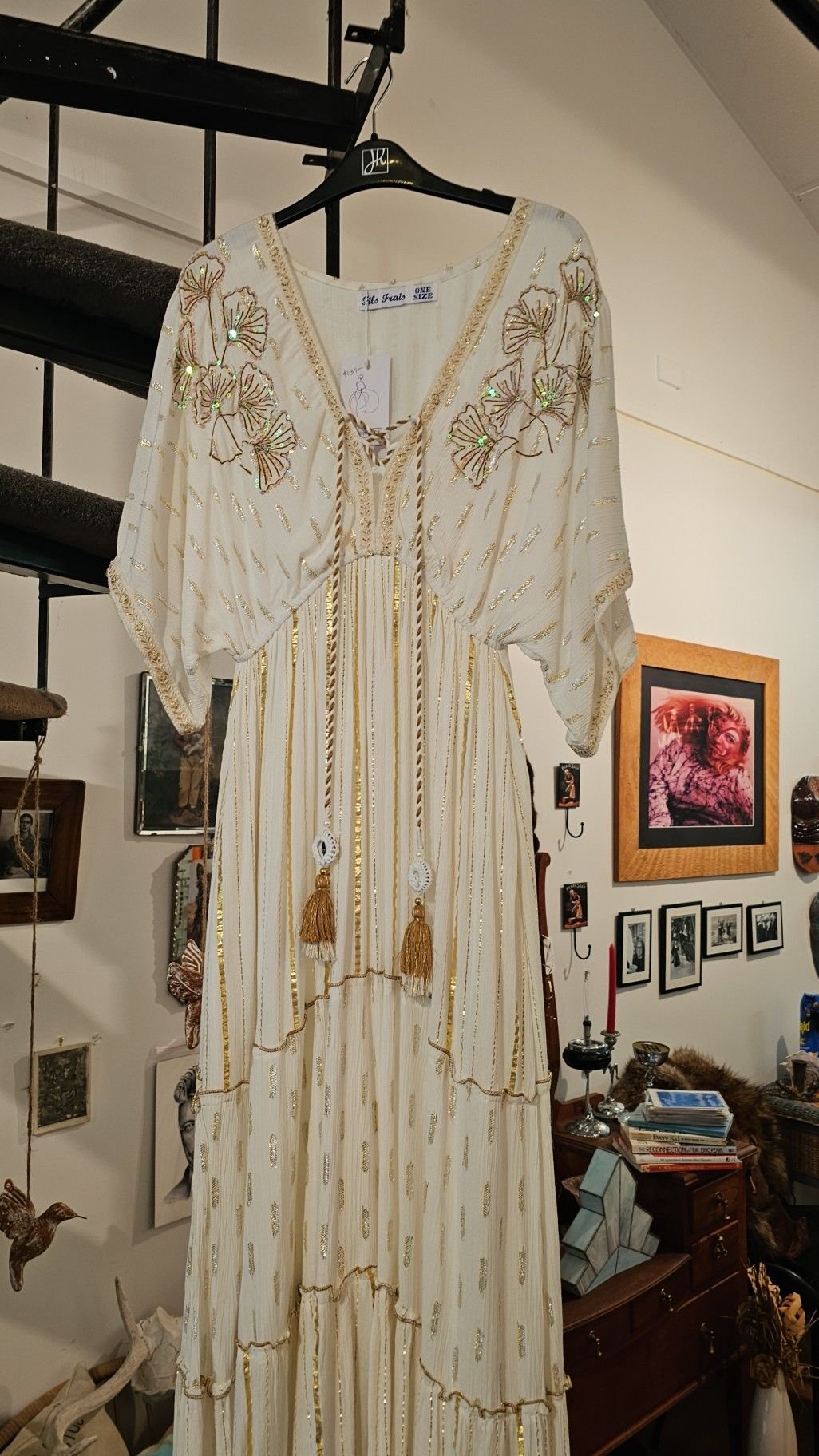 This Vintage style Dress is in Cream, and Gold is stunning on is O/S with a cotton underskirt great for parties of Festivals